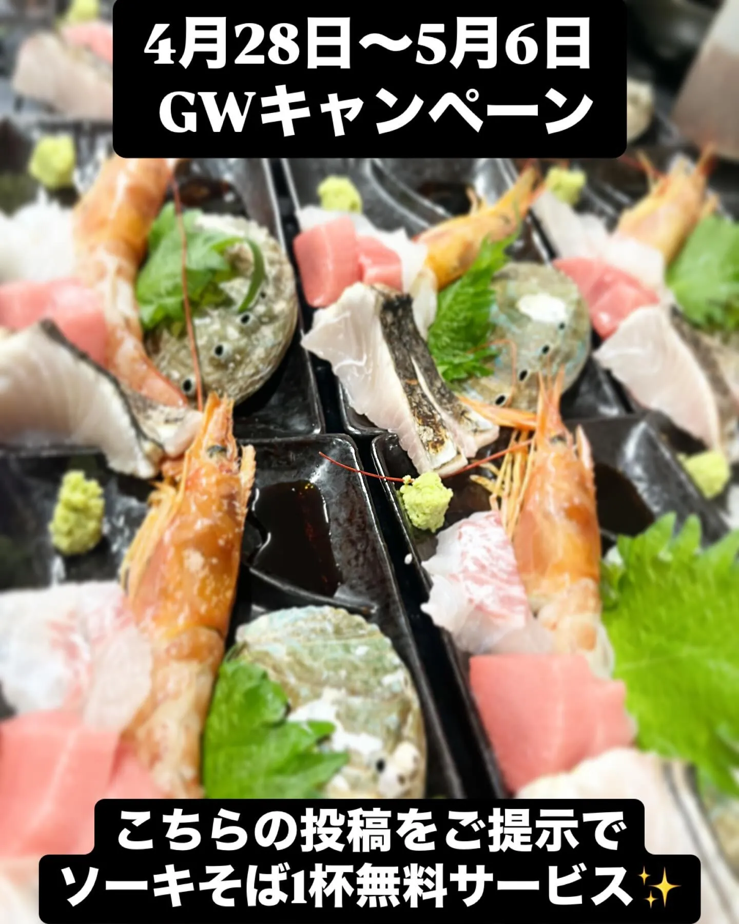 GW期間中4月28日〜5月6日はこちらの投稿をご提示でソーキそばを1杯無料サービスさせていただきます!